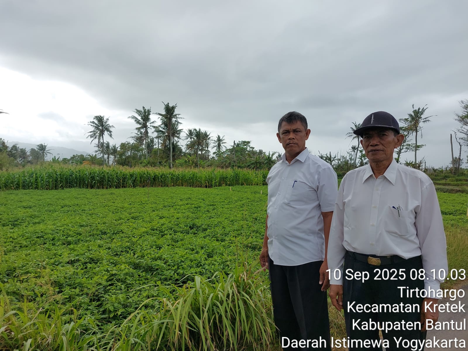 Panewu Kretek Cahya Widada., S.Sos., MH didampingi Kepala Jawatan Keamanan Parjono., SE., MM Bersama Petugas BPP dan Lurah Tirtohargo memantau lahan pertanian diwilayah Kalurahan Tirtohargo yang baru saja tergenang oleh banjir akibat naiknya air laut Pantai Selatan, Rabu 10 September 2025 selatan Jalan Lintas Selatan wilayah Tirtohargo.